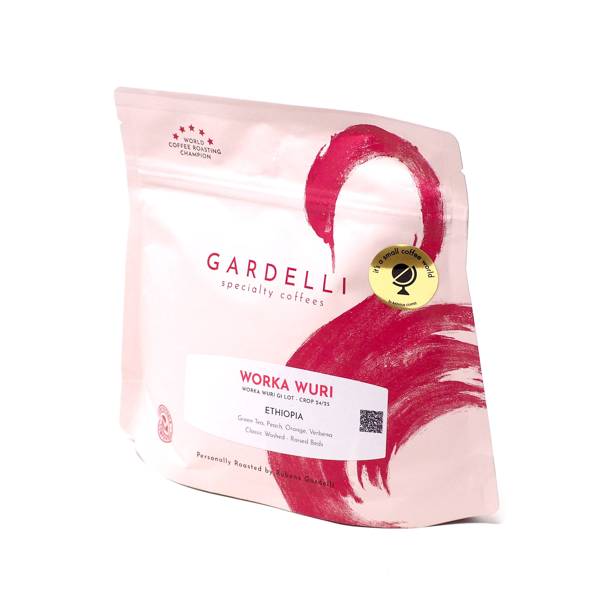 ロースターについて: Gardelli Specialty Coffeesは、2018年のWorld Coffee Roasting ChampionであるRubens Gardelli率いるイタリア・フォルリのロースターです。「Acidity is not a crime」をキーワードに、フィルターとエスプレッソどちらにも最適なオムニローストで焙煎をしています。